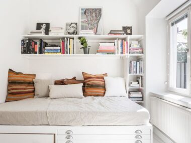 Using mirrors, light colored walls, compact furniture, and vertical storage helps create the illusion of space.